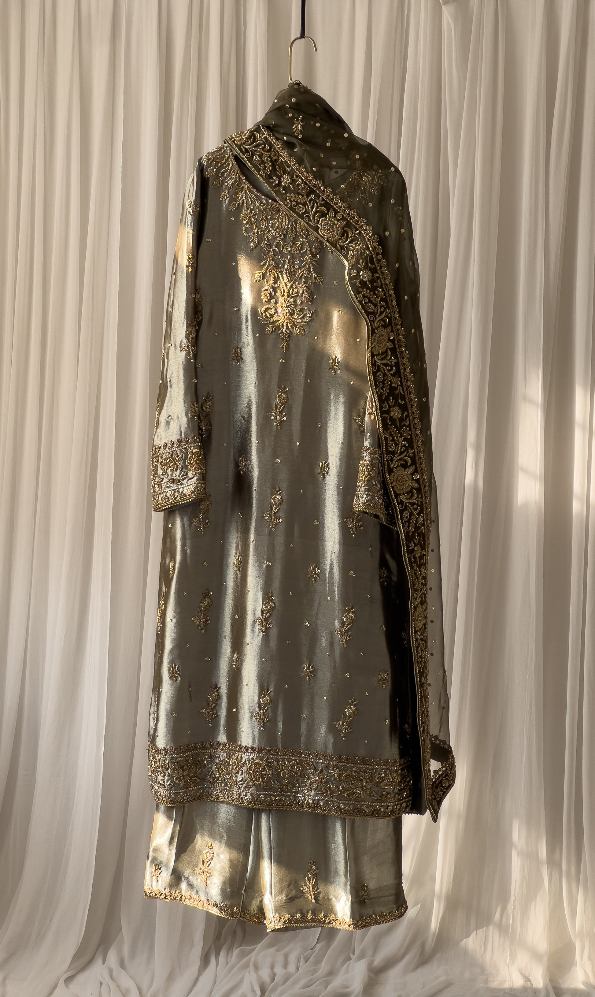 A timeless 3Pc ensemble crafted on luxurious Kundan Tissue, intricately embellished for a subtle yet regal shine. Paired with embellished trousers and a Pure Organza Dupatta that adds graceful volume and movement. Perfect for wedding appearances, intimate functions, and shadi festivities, this outfit blends tradition with effortless sophistication.