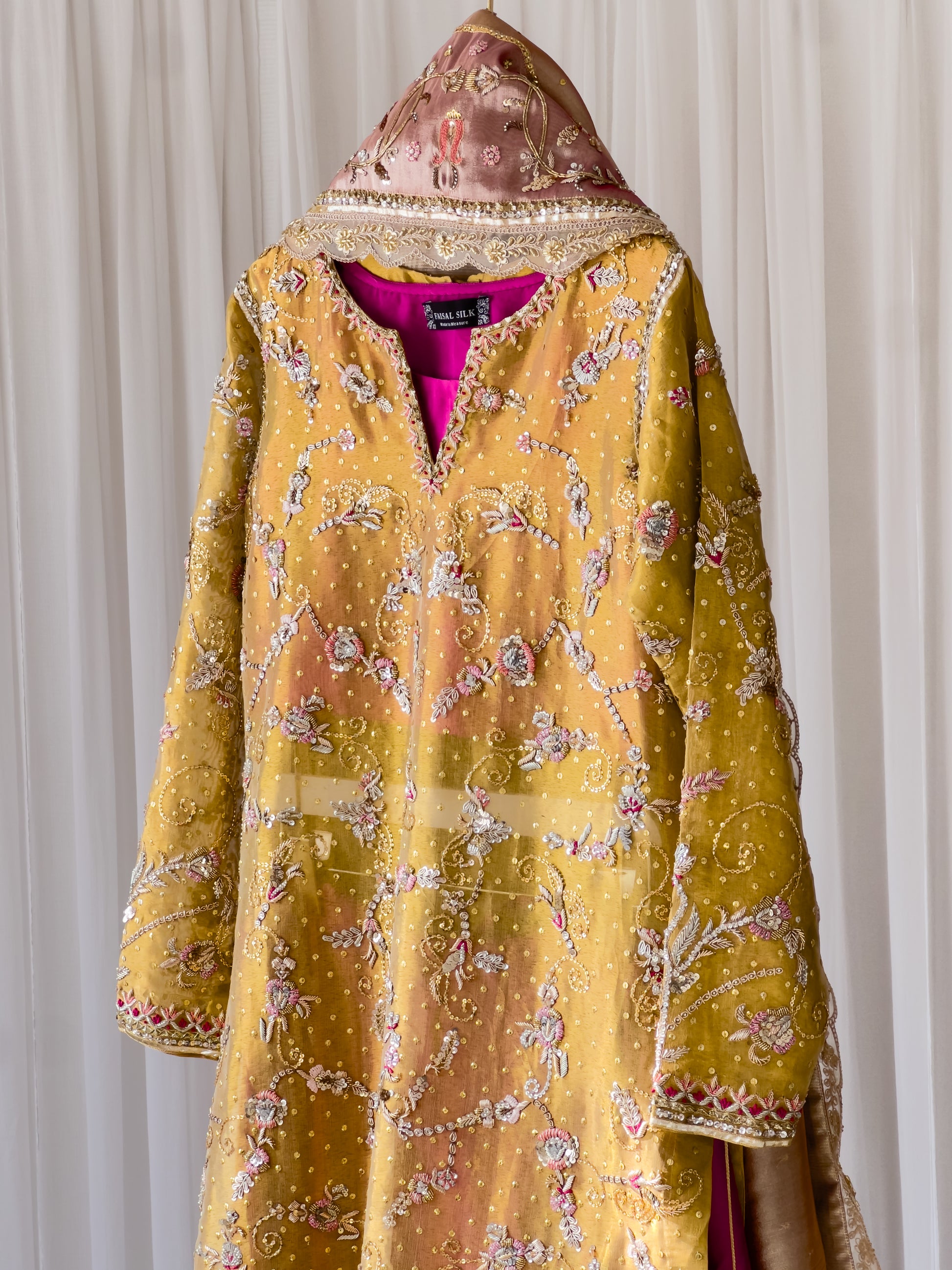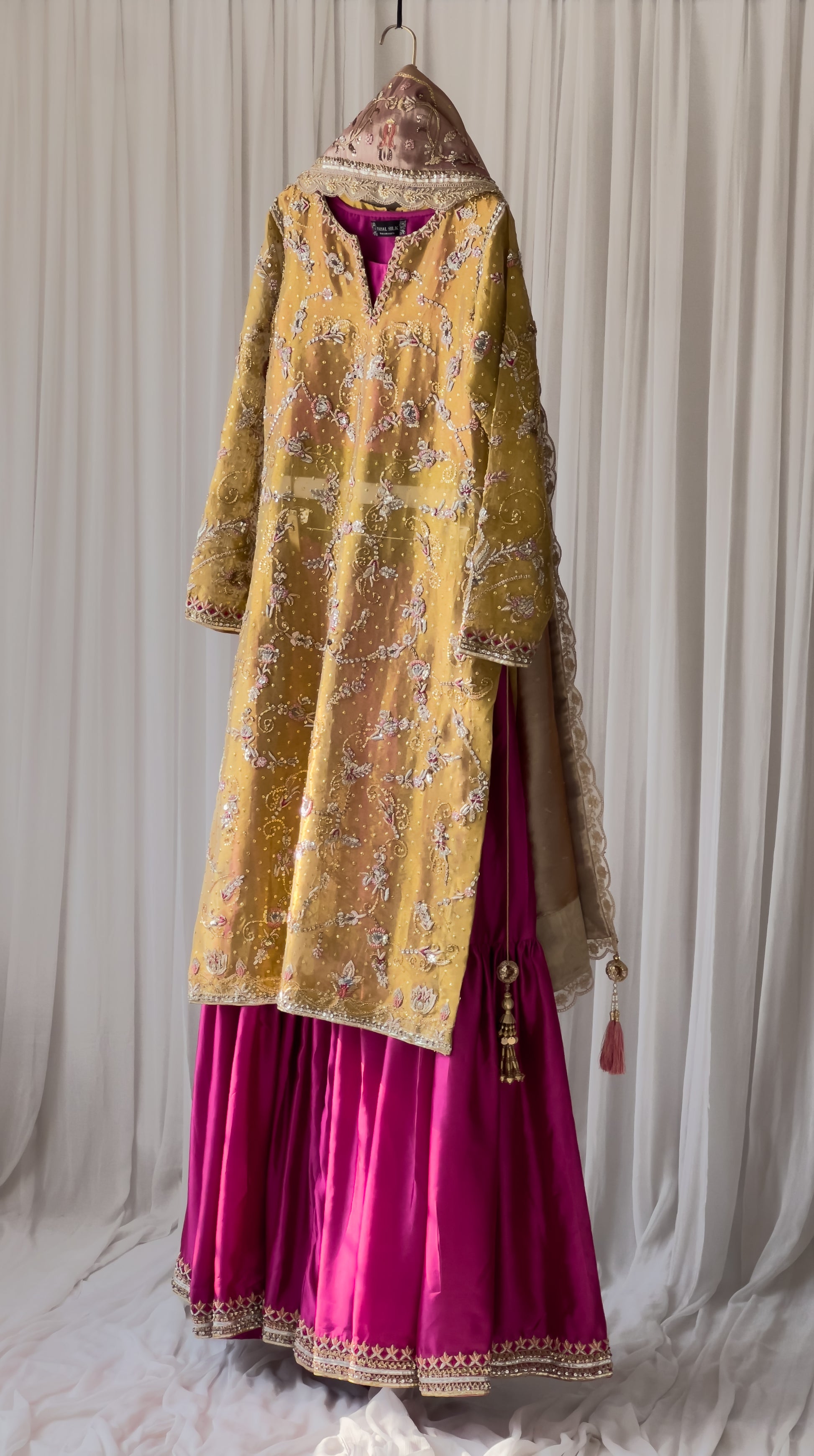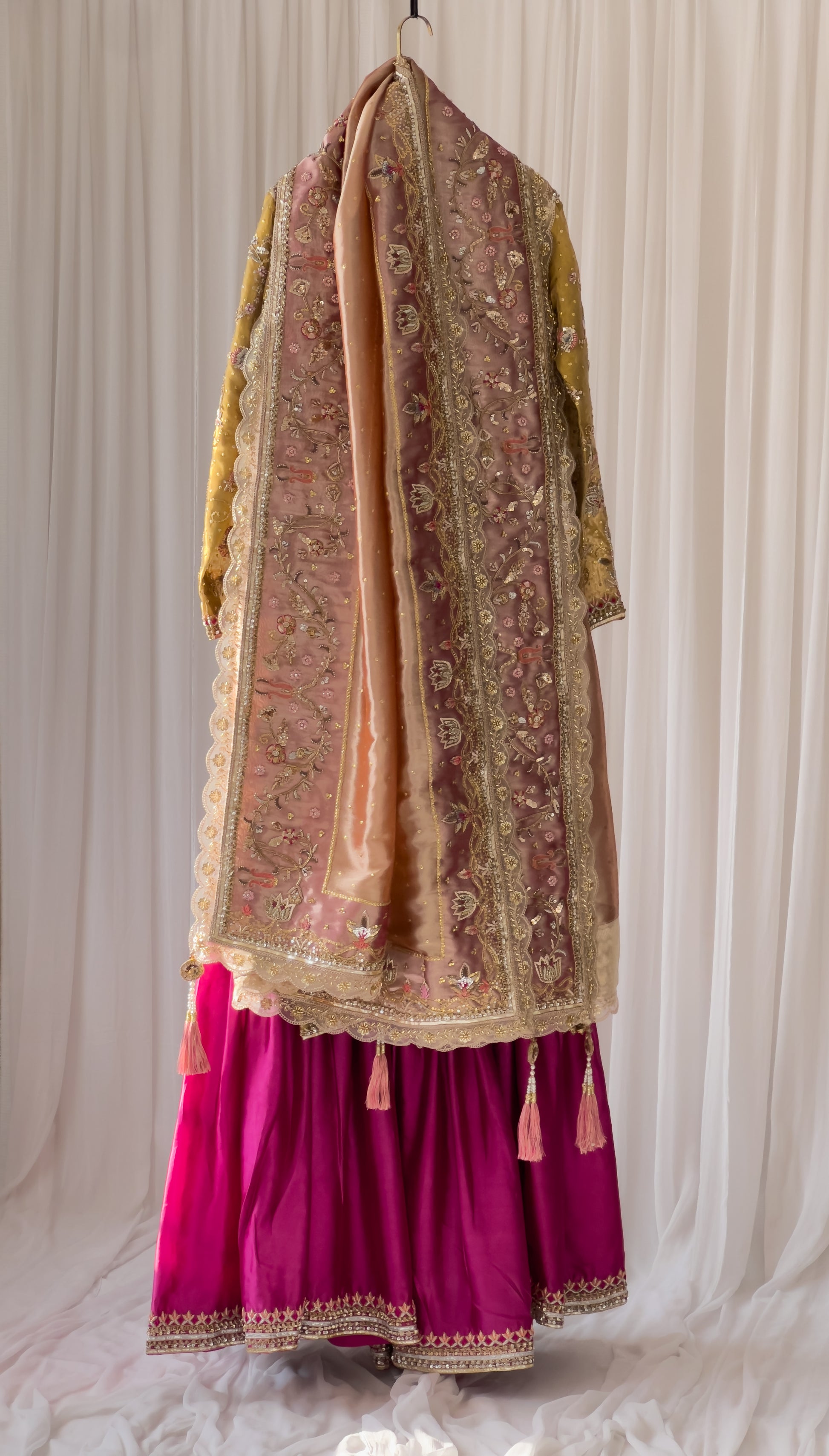 Gold kameez, Deep pink gharara and Rose pink dupatta