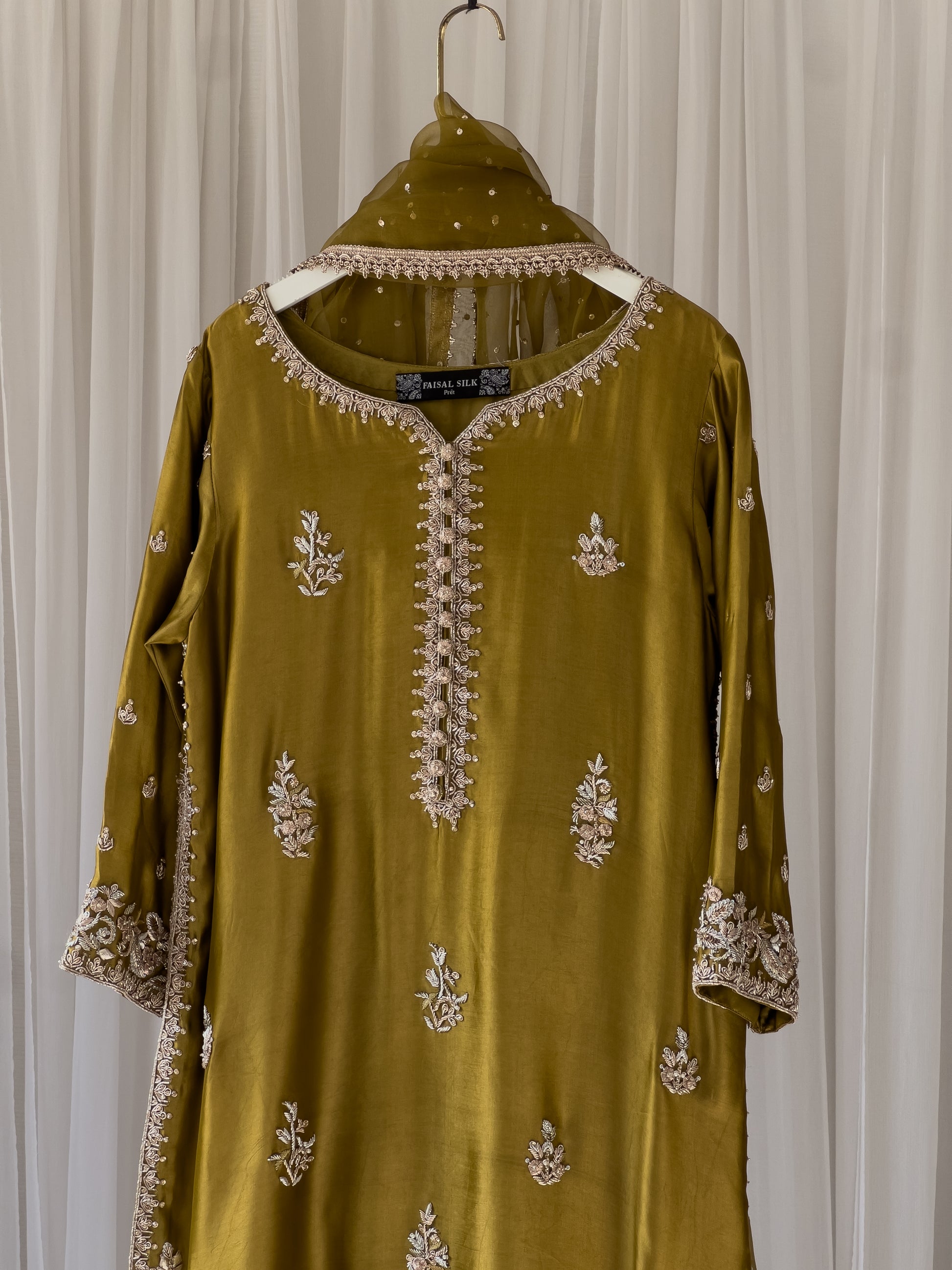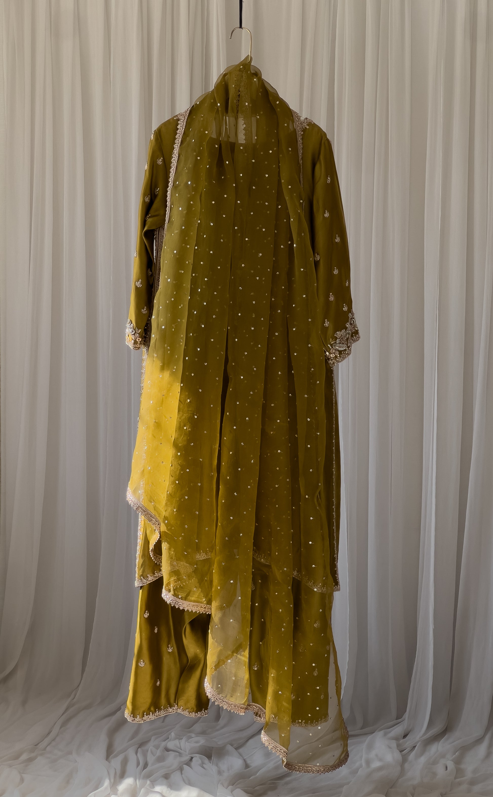 The Raman set is a masterclass in understated luxury, featuring a custom-made kameez and shalwar in a rich, soul-stirring deep olive. Designed for the modern woman, this three-piece ensemble balances a grounded, structured silhouette with an effortlessly light dupatta. It’s a custom-crafted tribute to clean details and timeless heritage.