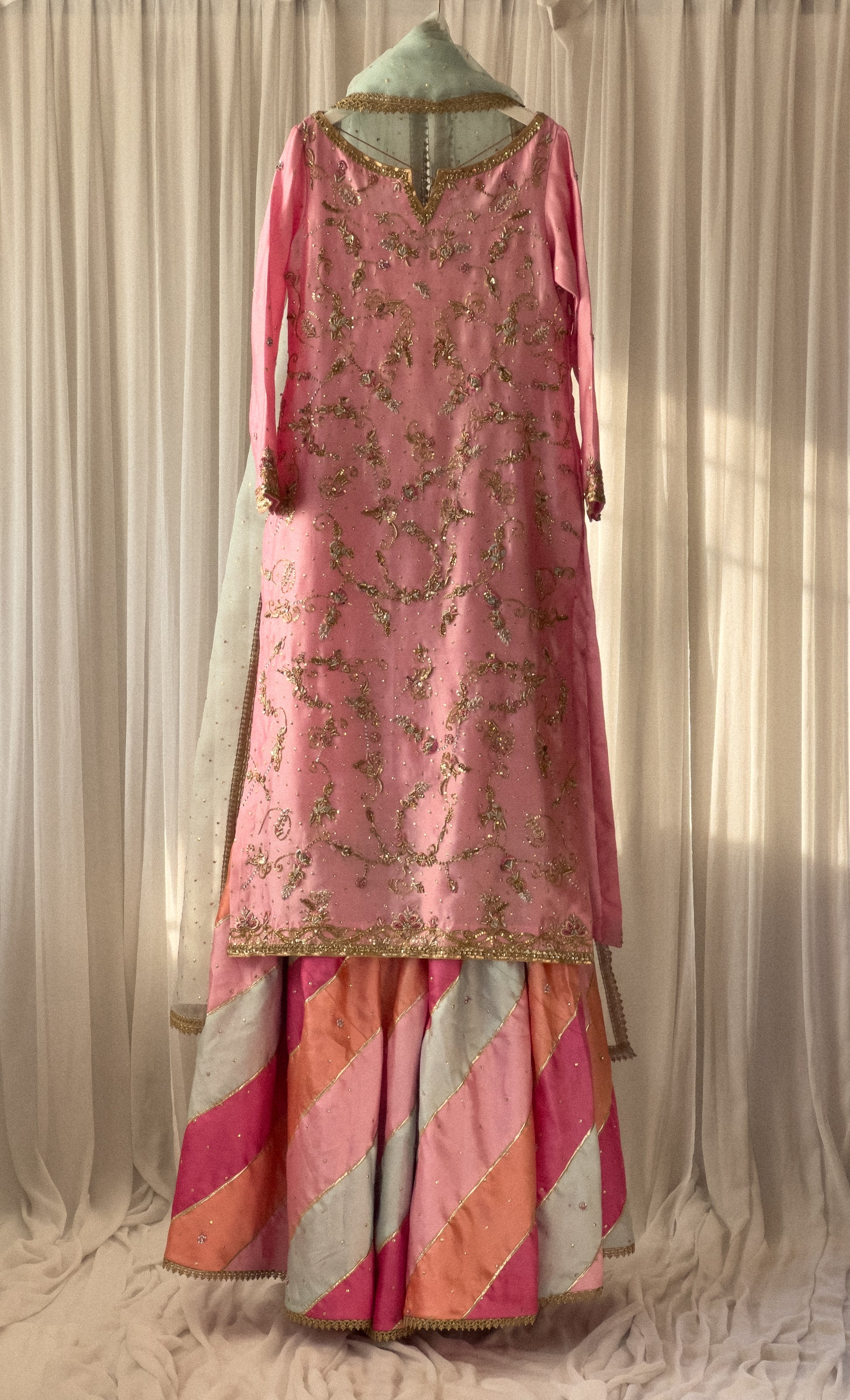 A graceful three-piece ensemble featuring a finely crafted kameez, a chatta patti gharara, and a complementing dupatta. Designed in soft, festive tones, this outfit is perfect for mehndi, mayoun, and intimate celebrations. Delicate details and an elegant silhouette come together to create a look that feels joyful, refined, and effortlessly timeless.