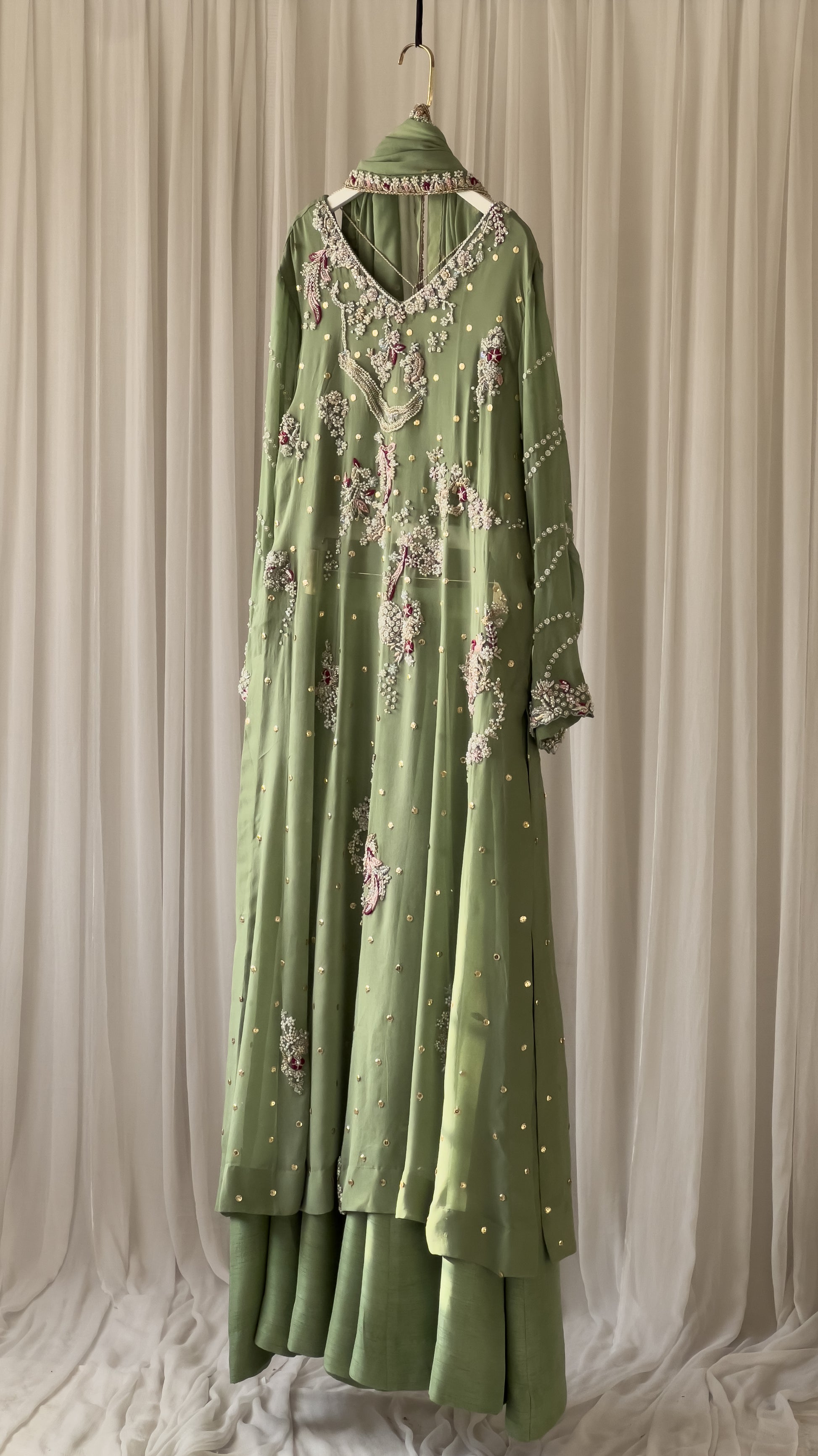 A vibrant three-piece ensemble featuring a beautifully embellished kameez, chic lehnga, and a dupatta adorned with classic resham detailing. Crafted with delicate hand embellishments and festive charm, this outfit is perfect for mehndi, mayoun, nikah, intimate events and all joyous celebrations. This outfit was produced on the customer's inspiration. The original inspiration for this design is from Dolly J.